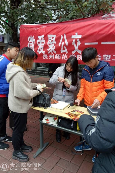 本网讯 为了展现青年志愿者的精神面貌、帮助他人在乘坐公交出行无零钱投币的问题,3月18日至19日,我院希望工程爱心使者联盟社团组织在乌当区温泉路口公交站开展为期两天的“微爱聚公交-零钱助换”服务活动。