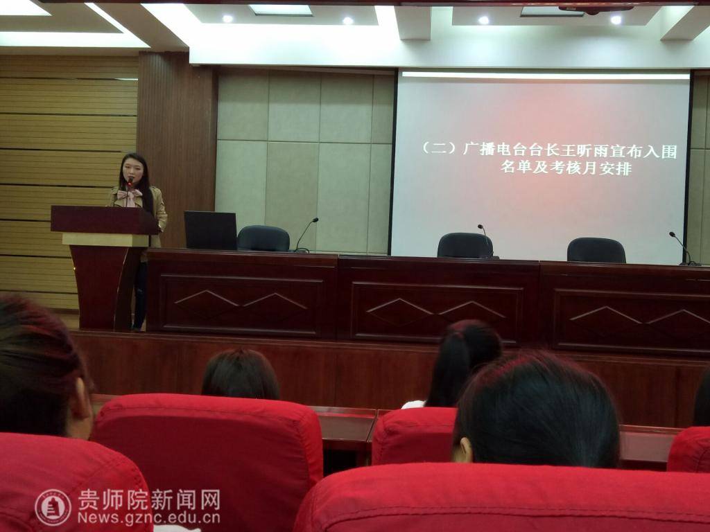 随后,王昕雨宣布入围名单及考核月安排,副台长王运佳宣读奖惩制度和考勤考核制度。紧接着新生代表秦苏发言,她表示很荣幸加入广播电台大家庭,并将满怀激情和热血,与大家一起共同努力,共同进步,共同成长。随后,主席团助理肖亚雄带领新生作电台感言。