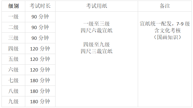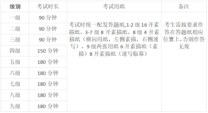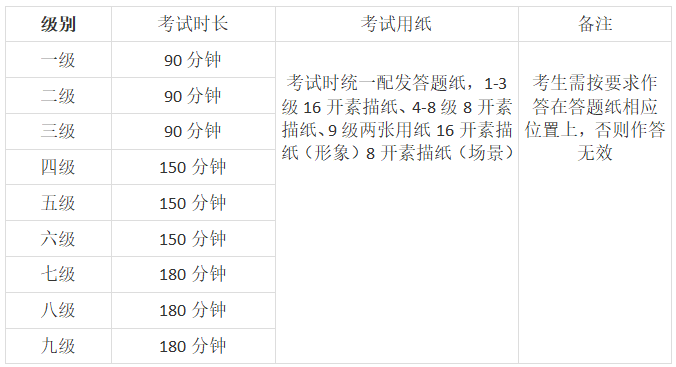 上午考试科目:素描(1-9级)、动漫画(1-9级)、国画(1-9级)