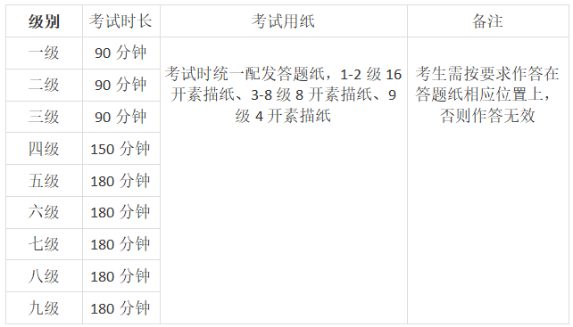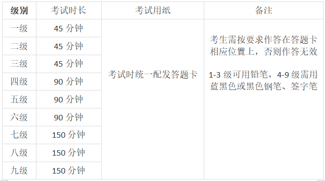 各科目级别考试时长及考试用纸