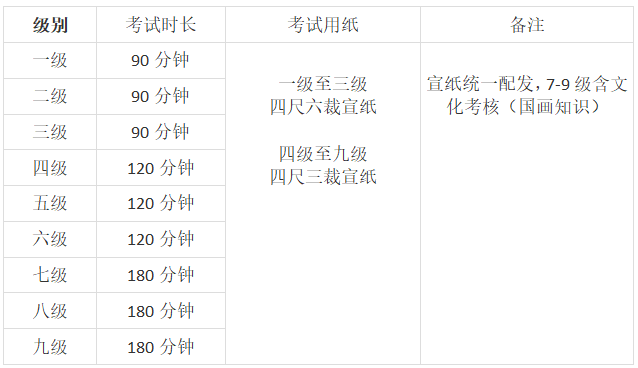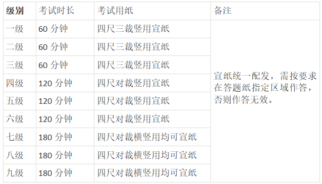 上午考试科目:毛笔书法(1-9级)