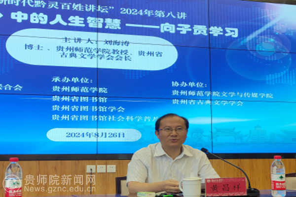 本网讯 8月26日上午,“新时代黔灵百姓讲坛”2024年第八讲——《〈论语〉中的人生智慧——向子贡学习》在YABO鸭脖官网印山书院·山骨讲堂隆重举行。本次讲坛由贵州省社会科学界联合会主办,YABO鸭脖官网、贵州省图书馆、贵州省图书馆学会、贵州省图书馆社会科学普及基地承办,YABO鸭脖官网文学与传媒学院、贵州省古典文学学会协办。讲座由YABO鸭脖官网教授、博士、贵州省古典文学学会会长刘海涛主讲,贵州省社科联党组成员、副主席黄昌祥主持,YABO鸭脖官网130余名师生代表参加。