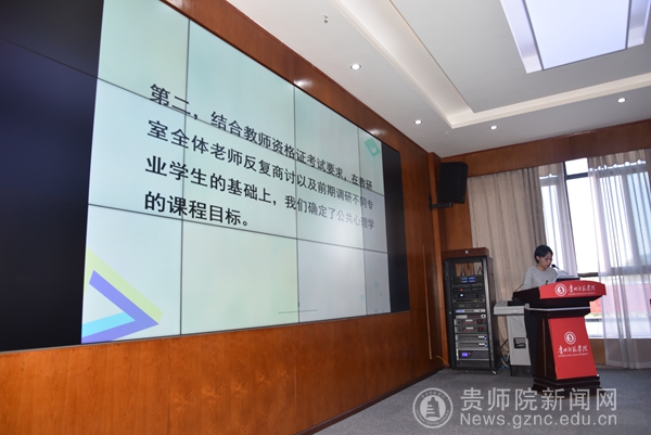 教育科学学院刘婧老师以《0BE理念下公共心理学教研室活动开展》为题,就修订教学大纲、确定课程目标、持续完善课程资源三个流程作了交流发言。