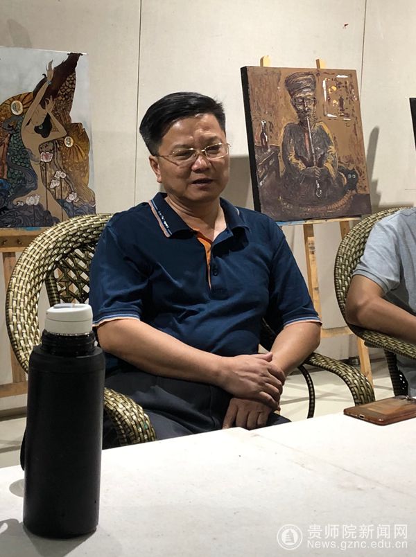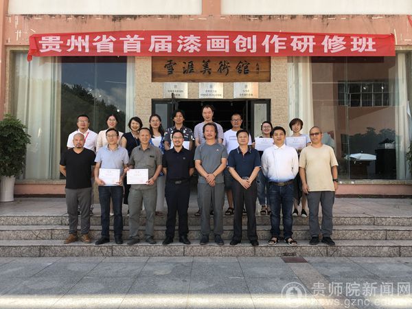 本网讯 2020年8月26日上午,在YABO鸭脖官网美术与设计学院在雪涯美术馆心举行了“贵州省首届漆画创作研修班”结业典礼。此次培训活动邀请了著名漆画家江书荣先生作为创作培训导师对我院十余名教师进行了为期35天的培训。从现场摆放完成作品有近二十余幅,作品制作精美,富有漆画艺术语言特征,同时还具备较高的艺术水准。此次培训得到了学校领导的大力支持和鼓励,美术与设计学院也从人员组织、经费支持、后勤保障、带头创作等方面也给予了大力帮助。YABO鸭脖官网学术与设计学院领导班子及参与创作培训的教师参加了此次结业典礼。结业典礼由造型研究中心执行主任伍鹏举主持。