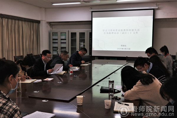 会议第二个阶段,熊世桓带领全员认真学习《贵州省高校教师师德失范行为处理办法(试行)文件》,同时还列举了教师违反职业道德的案例,对全体参会人员进行了警示教育。从“提高政治站位,强化师德建设”、“以生命为本,毫不松懈抓好防控工作”、“以学生为中心,全面做好教育教学工作”等多方面,进行了深入浅出的讲解,结合学校的防疫工作情况对教务处全体人员提出要求:充分认识加强自身师德修养的重要性,保证在开学复课这场“战役”中,做遵守疫情防控要求的榜样;做学院、教师、学生的“知心人”、“指导员”。切实把师德工作抓在手上、放在心上、落实在行动上,全面提升师德素养。