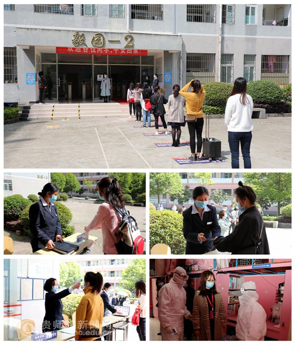 演练学生进入寝室情景。学生间隔1米排队,用免洗洗手消毒,通过身份核验后,宿管人员为学生发放防疫手册,再经过测量体温,登记后,学生沿地标路线依次靠右进入寝室。演练应急情景及应对措施,学生在宿舍测量体温时发现自己体温超过≧37.3℃,身体感觉不适,同宿舍同学立即打电话给医生,寝室长打电话给辅导员。医生快速赶来接走生病同学至寝室外的留观区,待医疗车到达后,护送学生至乌当区人民医院。