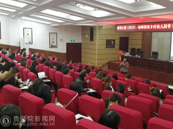 本网讯 11月16日,贵州省教育厅学前教育处处长谢旌为“国培计划(2019)——幼师国培乡村幼儿园骨干园长培训项目”(第二期)150名学员做了《学前教育在脱贫攻坚中的使命和担当》的专题讲座,教育科学学院学院教师罗艳华主持了本次讲座活动。
