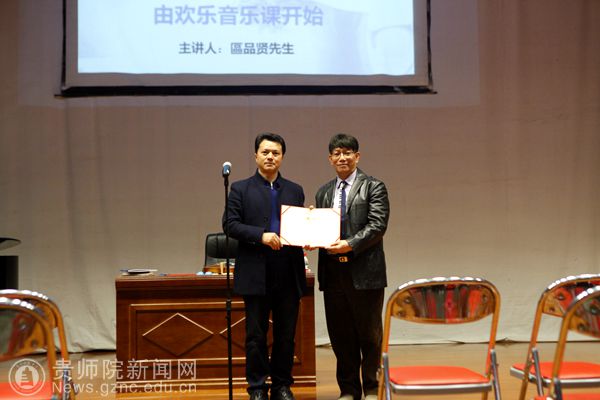 本网讯 11月27日下午,中国--东盟音乐舞蹈教育学术研讨会系列活动邀请到了香港著名中小学音乐教育专家區品贤先生做题为“移风易俗,莫善于乐——从欢乐音乐课开始”的讲座,讲座由音乐舞蹈学院院长马关辉主持。音乐舞蹈学院音乐专业师生参加了本次讲座。