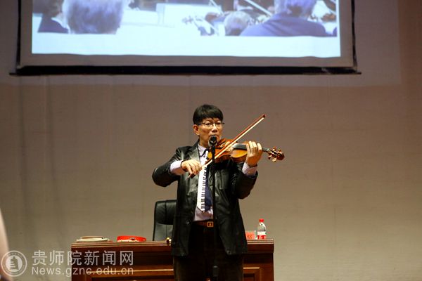 區品贤以欢乐课堂开始,带动全场师生以拍手、轻拍桌子打节奏的方式与全场师生互动。随后用小提琴现场演奏《欢乐颂》,带领大家了解音著名乐家贝多芬的事迹,让师生们在轻松愉快的氛围中积极主动地学习课堂知识。