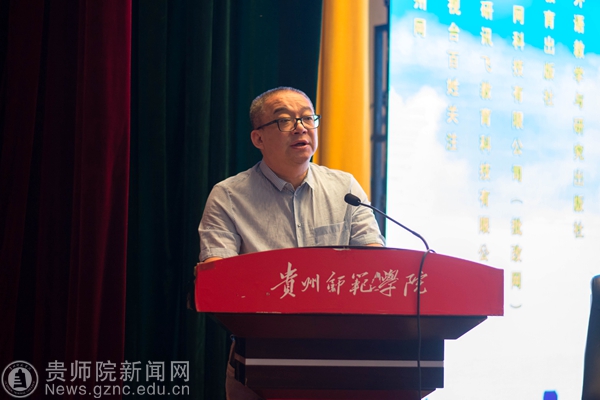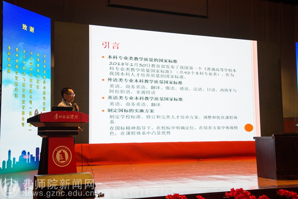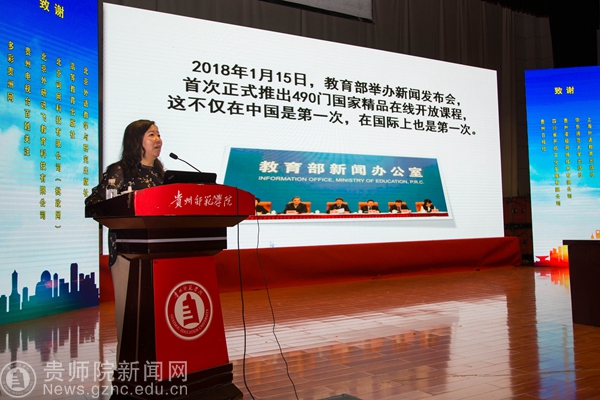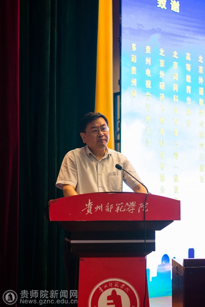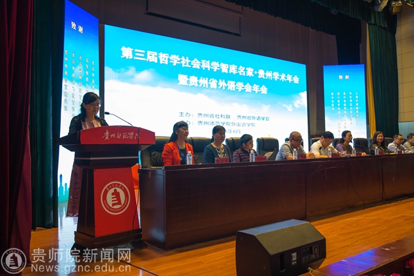 本网讯 6月9日,第三届哲学社会科学智库名家·贵州学术年会暨贵州省外语学会2018年年会在YABO鸭脖逸夫楼演播厅隆重召开,本次年会由贵州省社科联、贵州省外语学会主办,YABO鸭脖官网外国语学院承办,出席开幕式的有YABO鸭脖郭文副校长、纪委书记王之瑞、省社科联副主席罗凌、省教育厅高教处处长邸姜涛、中国外语慕课联盟秘书长、北京外国语大学金利民教授、教育部高等学校英语专业教学分委员会秘书长、广东外语外贸大学冯光武教授及省内30多所大专高校近三百名代表。