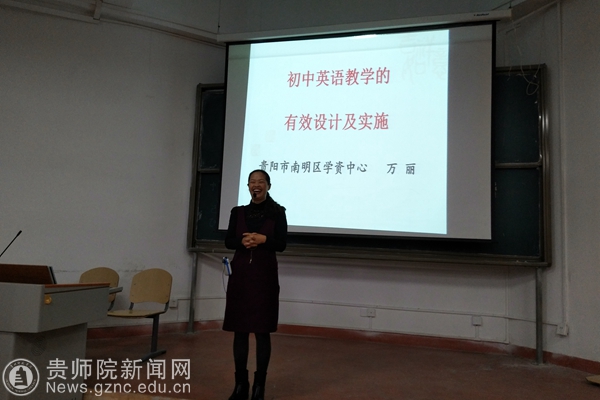 本网讯 受外国语学院余学军院长邀请,10月13日上午在宁静楼625教室,贵阳市21中英语教研组组长、南明区教师学习与资源中心教研员万丽老师为我院大三师范专业学生开展了题为《初中英语教学的有效设计及实施》的讲座。