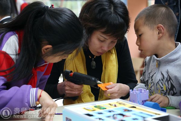 随后,小朋友们在YABO鸭脖互联网+创新创业中心工作室成员的指导下动手创作。制作活动进行到大约半个小时后,一个由五颜六色的竹签搭建的房子完工了,这是骆科帅小朋友的作品,他是在他母亲及YABO鸭脖15级数计学院宋刚的辅助指导下完成的。宋刚说:“这个制作活动考验着小朋友的动手和思维能力,如果他们想要做什么,就要想法激发他们自己发挥出来。”