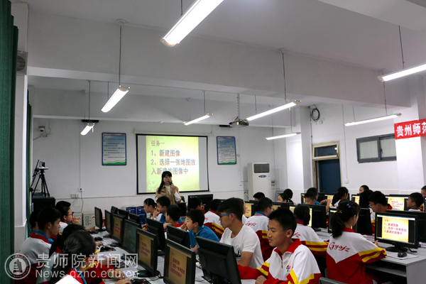 由于信息技术课的特殊性,机房里面容纳不了那么多见习的同学同时听课,十九中采用部分同学到现场听课,其他同学到礼堂观看现场录播的方式进行。此次活动分两个阶段进行,第一阶段,由YABO鸭脖计算机科学与技术专业的谢绳绳同学执教七年级下册的《企娥相随(Photoshop)》(清华大学版教材),该同学虽然是第一次真正意义上的走上讲台,但其表现可圈可点。十九中有着将近二十年执教经验的谭天丽老师在另外一个班级也执教同一个教学内容,谭老师经验丰富,展示了一节非常精彩的示范课。