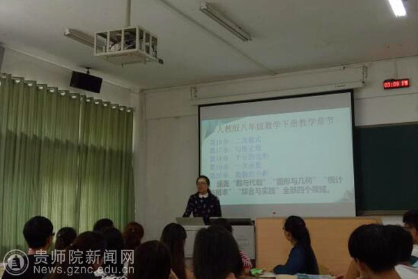 本次活动分两个环节:第一环节由贵州省第六届中学数学优质课一等奖获得者欧春龙分享参赛的备课经验,欧春龙从备课、经验、教训、收获四个方面分享他在准备优质课比赛过程中的辛苦历程。分享会结束后,李艳琴对分享会做简要总结,并对卓越教师班同学提出要进一步熟练地掌握超级画板的使用、练好三字和普通话,为以后从教打下基础。接着,名师工作室主持人丁光琴依次从二次根式、勾股定理、平行四边形、一次函数、数据的分析针对人教版八年级下册教材进行剖析,重点围绕教学目标、教材呈现意图与教师教学建议进行教材分析的专题讲座。肖宏治对丁光琴的专题讲座做简要总结,对卓越教师班同学也提出了明确的要求和真切的期盼。此次分享会和专题讲座取得了圆满成功,为正在开展中小学数学教材分析的卓越教师班全体同学提供了一个很好的学习机会和交流平台,增强了同学们对教材分析的信心,为他们以后的教学生涯打下了坚实的基础。