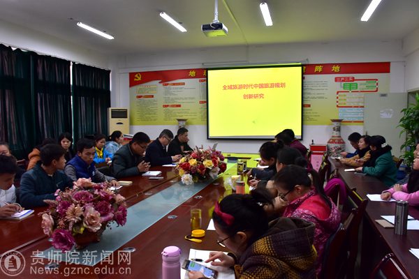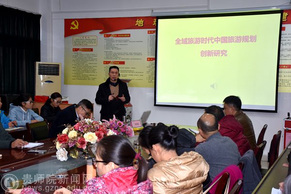 本网讯 11月29日下午,贵州旅游研究院第十届山地旅游学术研讨会由旅游研究院主办、地理与旅游学院承办,北京绿维创景规划设计院贵州分院院长、高级规划师陈慕挺做了主旨演讲,研讨会由校长助理徐凤增主持,地理与旅游学院党委书记吴亚平、院长李乐京、副院长张凤太以及地理与旅游学院部分老师和学生参加此次研讨会。