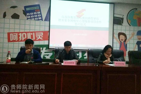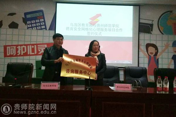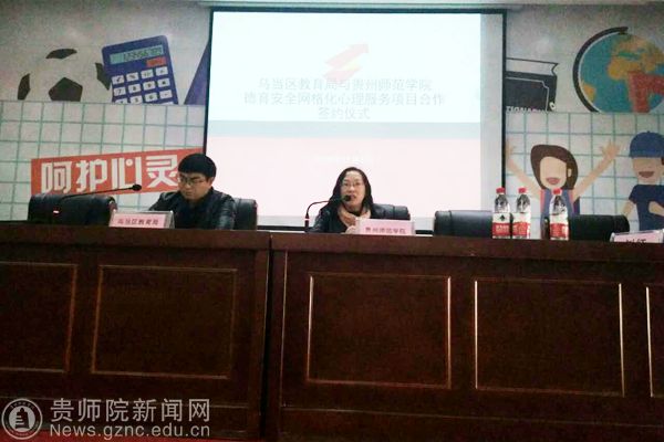 会议开始,刘丽介绍了德育安全网格化心理服务项目合作背景,提出当前环境下,乌当区教育局非常重视学校心理健康建设,所以此次合作非常有意义,同时对具体合作情况做了详细介绍。会议第二项是双方领导签订项目合作合同书,也标志着双方合作正式启动。会议第三项,是双方进行了授牌仪式,由李波代表乌当区教育局授牌,授予YABO鸭脖官网教育科学学院为“乌当区未成年人心理健康咨询服务中心”。会议第四项是贵州师范倪磊对心理服务项目进行了具体安排,包括讲座主题、学生送课下校主题及形式、以及老师和学生指导送课次数安排、心理数据分析等事宜。会议第四项是刘红讲话,刘红提出这次合同的签订标志着双方合作进入新的阶段,也对送课同学提出要求,希望他们把在学校所学应用在实践当中,服务于各中小学校,认真对待,全力以赴;同时也希望各位校长老师对送课学生多多批评和鼓励,帮助他们成长。会议最后一项是乌当区教育工委李波副书记讲话,他提出希望此次合作能够达到双方共赢的效果,并预祝本次合作取得圆满成功。