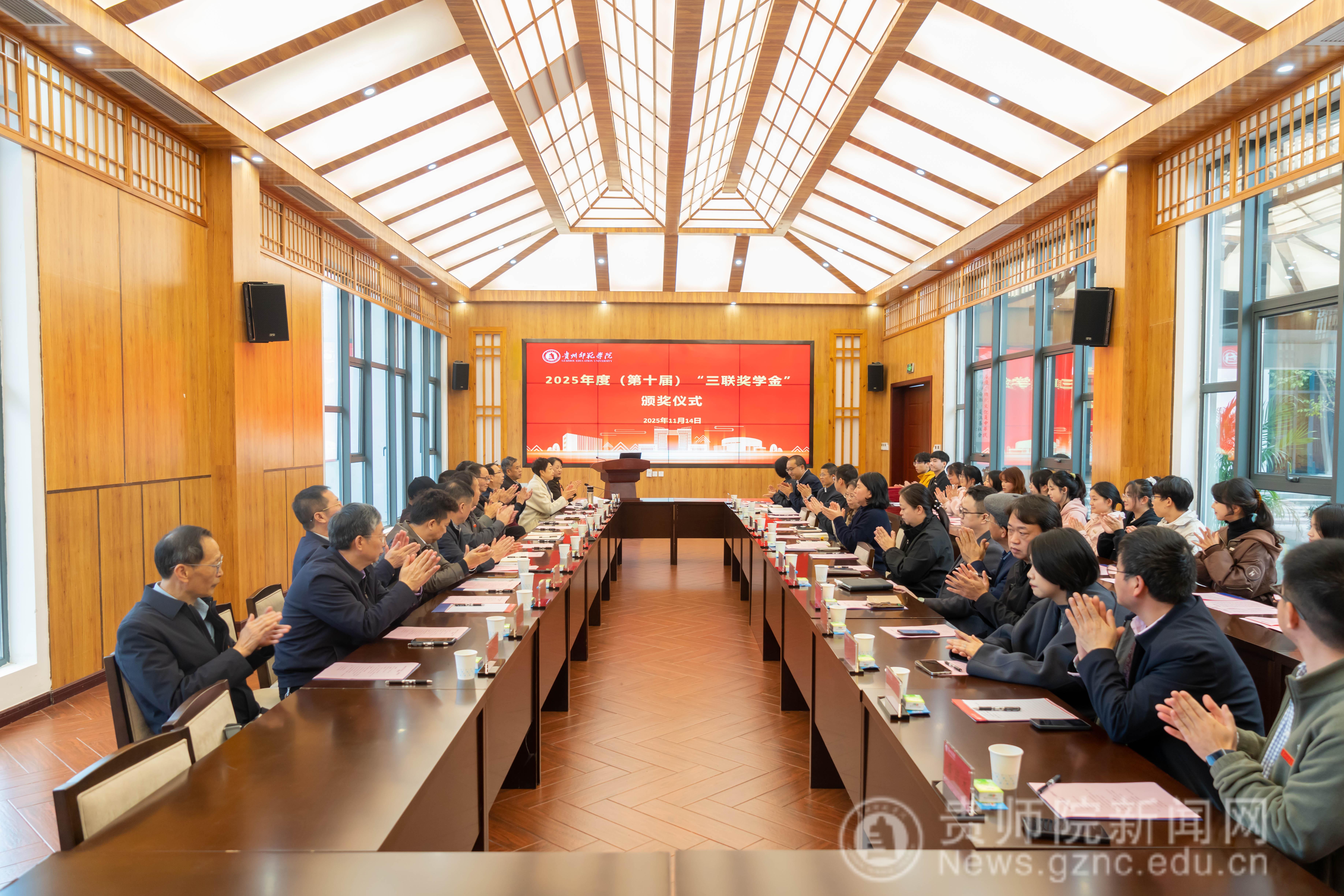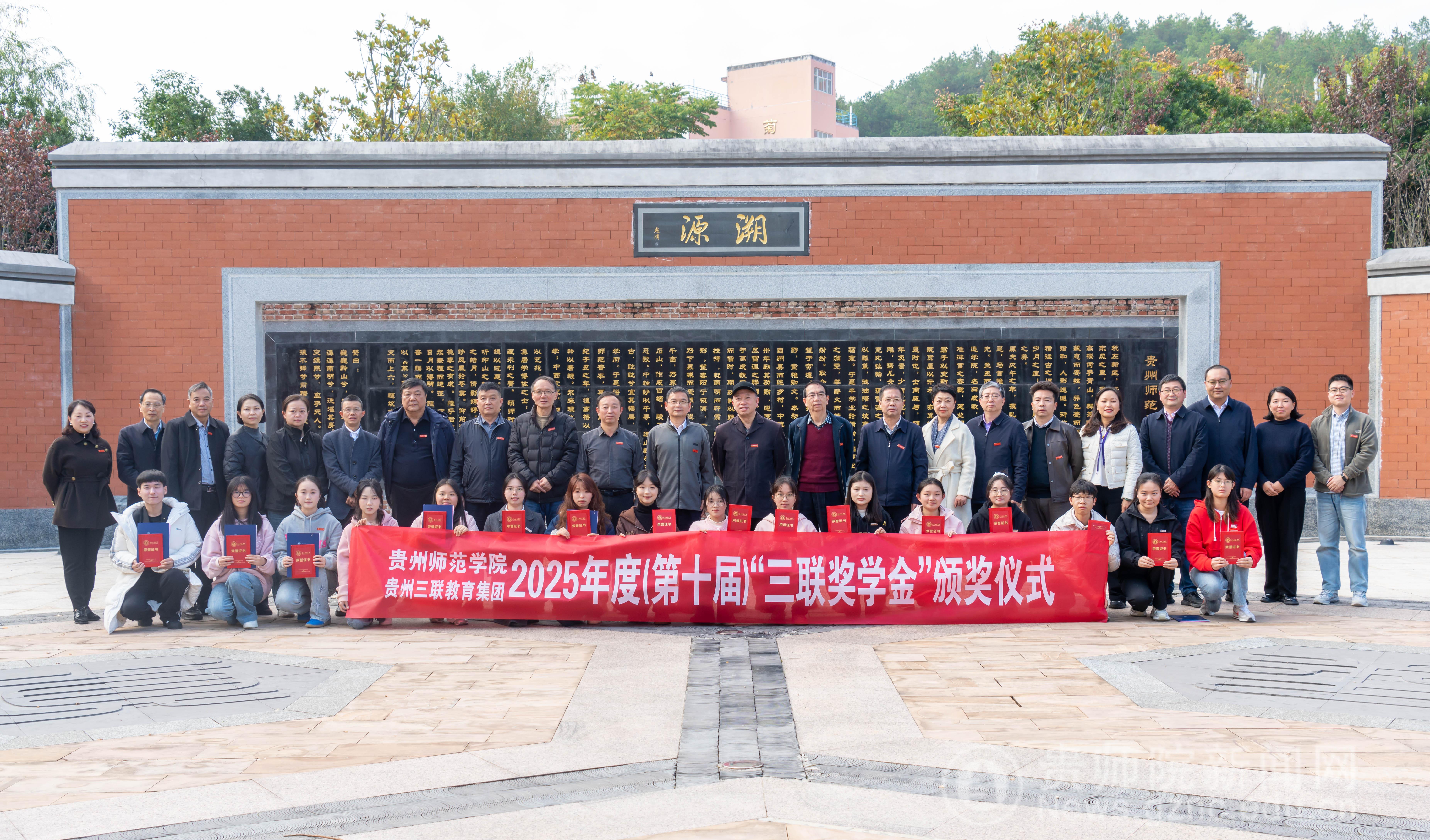 本网讯 11月14日,YABO鸭脖官网2025年度(第十届) “三联奖学金”颁奖仪式在印山书院山水讲堂隆重举行。学校原校长、贵州省YABO鸭脖官网校友会会长郁钟铭,YABO鸭脖官网党委常委、副校长陈真波,贵州三联教育集团董事长、校友会副会长肖开玉等一行嘉宾,各二级学院党委书记和老师,以及16名获奖学生参与。仪式由校友办主任敖永凤主持。