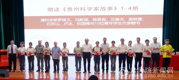 大会上,《贵州科学家传记丛书》编委会副主任、执行主编杨献忠介绍编撰情况,省人大常委会副主任杨永英、编委会主任班程农、科学家代表罗锡文院士、谢晓尧教授为新书揭幕,班程农主编、叶辛副主席、朱洪波书记、钱海峰副总编辑赠书《丛书》1-5卷,8位科学家为10位学生代表赠书《故事》1-4册,《贵州科学家传记丛书》集中展现了科学家对国家科学技术发展做出的重大贡献以及对贵州这片热土的奉献和热爱,表现了科学家在艰苦条件下的拼搏精神,弘扬了“科技兴国”“科技兴黔”的时代精神,将引导全校师生以这些科学家为榜样,胸怀“国之大者”、继续“追光”前行,以更加奋发有为的精神状态和一往无前的奋斗姿态为实现贵州省高质量发展的目标凝聚磅礴力量。