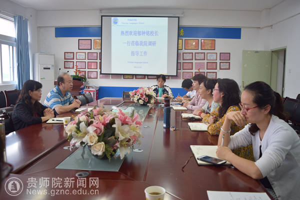本网讯 6月19日下午,校长郁钟铭、副校长郭文、党政办刘佳富老师一行到外国语学院调研并指导工作。外国语学院院长余学军、副书记刘红玲、副院长杨秀岚、教辅行政人员等参加调研座谈会。