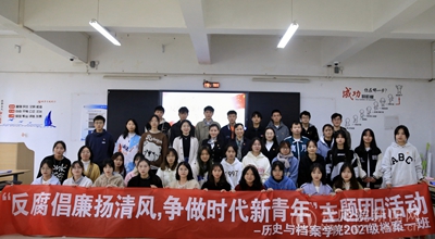 本网讯 廉洁是中华民族的传统美德之一,也是当代大学生应有的道德品质,为加强对广大青年的廉洁教育,历史与档案学院2021级档案学一班于11月18号下午,在明德楼423教室开展了主题为“反腐倡廉扬清风,争做时代新青年”的团日活动。校党委委员、副校长邹晓青,学院党委书记吴靖霞、院长梁瑞、团学负责老师王秋实、辅导员老师汪远秀出席活动,2021级档案学一班全体同学参加活动。活动由档案学一班团支部书记杨林宁主持。