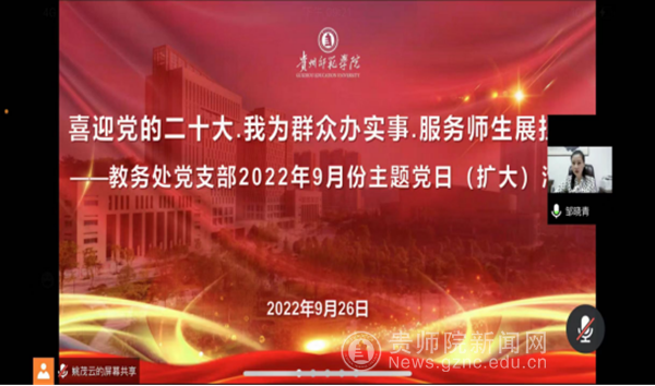 本网讯 为做好疫情防控期间党支部学习教育工作,引导支部党员在疫情防控工作中进一步发挥先锋模范作用,9月26日,教务处党支部以线上会议形式组织开展9月份主题党日活动,围绕“喜迎党的二十大·我为群众办实事·服务师生展担当”主题,深入开展政治理论学习,并传达相关文件精神,会上还进行了交流讨论并部署有关工作。支部全体党员、教务处处长邓琴等党外人士参加活动,校党委委员、副校长邹晓青以普通党员身份参加活动并发言。
