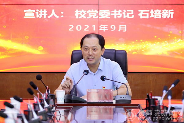 随后,石培新把习近平总书记“七一”重要讲话精神重大意义、丰富内涵、核心要义与实践要求浓缩成了“115491”的成功密码,并对其进行了深入浅出地解读。即“一个奋斗主题”——实现中华民族伟大复兴;“一个伟大精神”——伟大建党精神;“五个庄严宣告”——对中华民族伟大复兴迎来无比光明前景的豪迈宣示;“四个伟大成就”——中国共产党带领人民团结奋斗的丰硕成果;“九个‘必须’”——“以史为鉴、开创未来”的历史启示;“一个伟大号召”——广大党员在新时代“赶考之路”上的行动指南。他结合学校发展,再次将如何从百年党史中汲取前进力量的内涵进行了诠释,即:汲取坚守理想的力量,坚定不移坚持党的全面领导,以做到“两个维护”擦亮高校政治底色;汲取践行初心的力量,坚定不移坚持以人民为中心发展教育,以人民立场彰显高校办学本色;汲取担当使命的力量,坚定不移坚持立德树人,以培养堪当民族复兴大任的时代新人检验高校办学成色;汲取改革创新的力量,坚定不移深入推进教育综合改革,以扎根中国大地凸显高校办学特色。