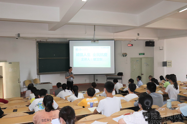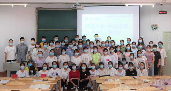 邬卫东作主题报告,他从将军山医院的概况、抗疫过程中遇到的一道道难题到问题是怎样很好的被解决等方面分享了他这一路的所感所想所悟。他曾经说过:“诚信就是言行一致,要么不说,要么说了就要做,而且做就要做成”。他的一声“保证完成任务”拉开了长达几个月的战疫帷幕。先是介绍了将军山医院是一所智能化系统很强的现代化医院。又分享了自身战疫经历、思想磨练历程、工作态度等方面并对同学们进行了思想教育。他将“坚持中国共产党的领导、坚持共产主义远大理想信念、坚持四个自信、坚持实事求是的科学态度”等,作为了此次战疫最深刻的感受。邬书记亲切而又振奋人心的讲话,使得教室里时而欢声笑语,时而寂静沉思。他要求同学们务必做到诚信,并希望同学们能够努力学习,增强自身的能力。