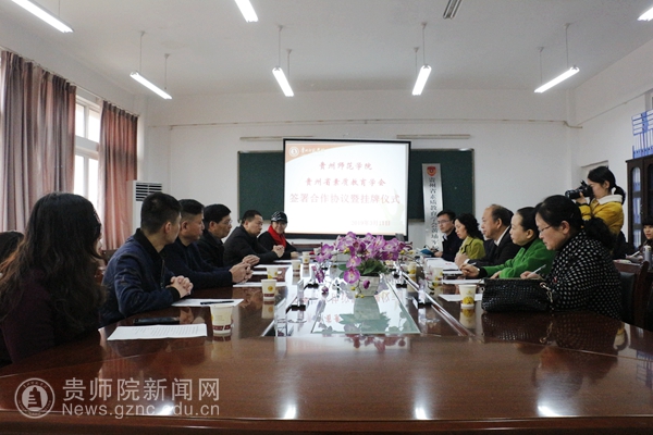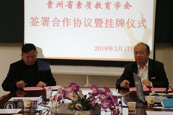 随后,校长郁钟铭与贵州素质教育学会法人代表韩锦铖签署了双方合作协议。韩锦铖把“贵州素质教育学会黄埔军校文焕研究会”牌匾授予给历史与档案学院。中国红色文化研究会文产研发中心秘书长紫秋向学会赠送了“兵魂”书法作品。最后,与会人员进行了合影。