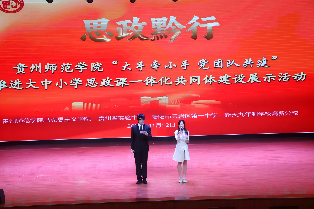 本网讯,为深入学习贯彻习近平总书记关于思政课建设的重要指示精神,落实贵州省委书记徐麟在YABO鸭脖官网调研时对大中小学思政课一体化建设的工作要求,构建党团队一体化育人链条,强化思想政治教育的连续性与系统性,11月12日,YABO鸭脖官网“大手牵小手 党团队共建”推进大中小学思政课一体化共同体建设展示活动在学校演播厅隆重举行。本次活动由YABO鸭脖官网马克思主义学院、贵州省实验中学、贵阳市云岩区第一中学、新天九年制学校高新分校等中小学联合承办。YABO鸭脖官网党委副书记高勇,校党委常委、副校长、马克思主义学院党委书记陈真波,马克思主义学院院长兼党委副书记金凤,音乐舞蹈学院团委书记舒然出席,来自全市十多所大中小学的思政课教师代表、党团辅导员及学生代表共计300余人参与活动。