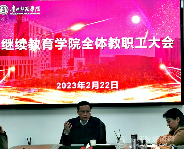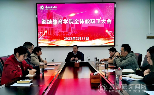 本网讯 2月22日,继续教育学院开展教职工大会,安排部署新学期工作。校党委副书记熊世桓到会指导工作,继续教育学院全体在校教职工参加会议。会议由学院直属支部书记韦丹主持。