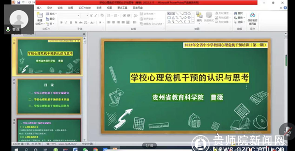 本网讯 当前,我国新冠肺炎疫情呈现点多、面广、频发的特点,防控形势严峻复杂,“外防输入、内防反弹”压力持续增加。为切实提升疫情下全省教师应对校园心理危机事件的识别和干预能力。近日,由贵州省教育科学院主办,YABO鸭脖官网承办、教科院协办的2022年贵州省中小学校园心理危机干预专题培训(第一期)成功举办,各市(州)100多名专(兼)职心理辅导教师通过腾讯会议参加了培训。