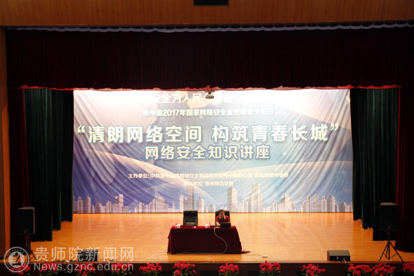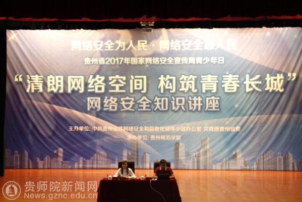 本网讯 为提升全省广大青年网络安全意识和安全防护技能,营造安全健康文明的网络环境,9月21日,由省委网信办、团省委主办,YABO鸭脖官网承办的贵州省2017年全国网络安全宣传周青少年日“清朗网络空间 构筑青春长城”网络安全知识讲座在YABO鸭脖逸夫楼演播厅举行。贵州省信息安全评估中心主任、高级信息安全等级保护测评师、省工控网络安全专家组成员、贵阳大数据“百人计划”培养对象周黎辉老师、团省委宣传部部长吴莉、团省委宣传部主任科员杨典、张淼绪,YABO鸭脖官网校团委书记张婷、副书记傅小芳,校团委全体成员出席此次活动。全省各地和YABO鸭脖近300名青年师生代表参加了活动。