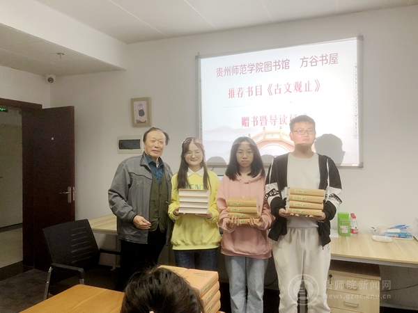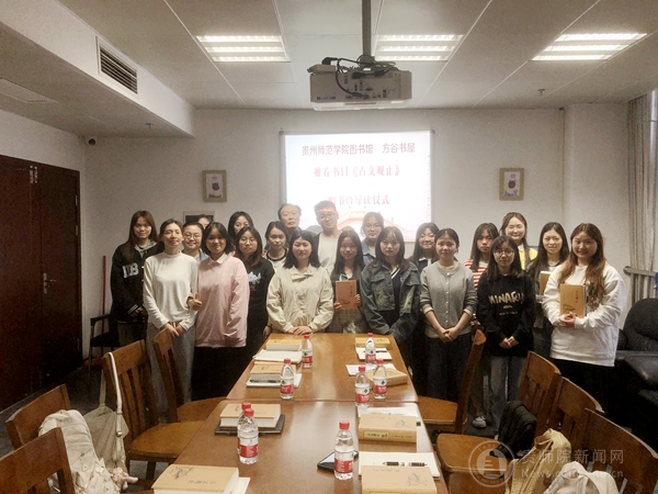 接下来周老师讲述了阅读《古文观止》让自己受益终身的事例,引出了向同学们推荐和赠送这本书的原因,同时告诉了同学们读这本名著的方法和经验,周老师的用心程度感动着在场的每一位同学,这也告诉在场的各位同学一本好书对人生的影响是极大的。在这一过程中,周老师和同学们一起背诵起了苏轼《前赤壁赋》,一起感受着文字的魅力,体会古人的智慧。帮助选拔受赠优秀学生的马智忠老师还提出了读书不仅为自己读,还要为贵州教育事业而读的观点,将读书与教育事业结合起来,立意深刻,给了各位同学极大的激励。之后进行了师生问答环节,周老师都一一耐心地回答,并用丰富的例子告诉了同学们宝贵的读书方法,在一片欢声笑语中结束了这个环节。最后,在此次赠书暨导读仪式结束之际,周老师与二十位学生一起合影留念,师生共同约定一个月后将再次聚首,开展第一次《古文观止》阅读心得的交流活动。