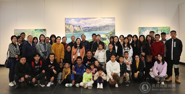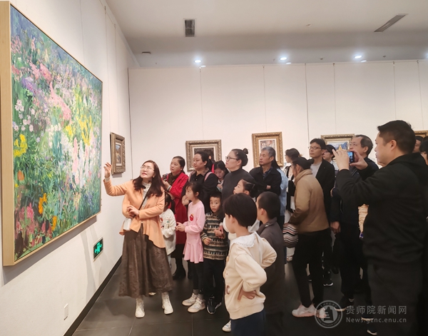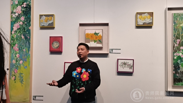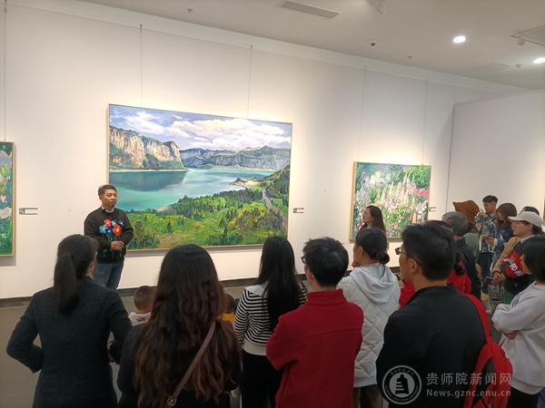 本网讯 “丹青咏叹美好时代——廖江华郑超文带您解读绘画艺术作品及创作分享”公教活动于10月14日上午在贵州美术馆8号展厅举行,现场汇集了众多圈内或圈外的美术爱好者,由YABO鸭脖官网美术与设计学院副教授廖江华老师和YABO鸭脖官网美术与设计学院郑超文老师带领观众走进展厅,边欣赏艺术作品边讲述自己的创作灵感及其蕴藏在作品中的情感与精神,大家饶有兴致地欣赏着艺术作品,不时还提出心中的疑惑与二位老师一同探讨。二位老师结合作品从贵州大山大水的自然之美与贵州地域的民族文化之美进行了“咏物”与“咏怀”的美学诠释,从自然美对美育的促进、人生美与自然美的物我交融的审美体验,从一花、一景中上升到人的品格美、人的风度美育情感美,在讲解中,观众随着二位老师体验了他们的艺术之路与审美人生。