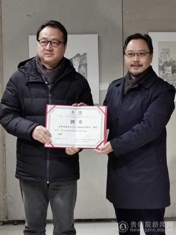 活动现场,杨亚杰向YABO鸭脖官网捐赠了书画作品《溪山烟云》,邹晓青代表YABO鸭脖官网接受捐赠,并向其颁发了收藏证书。聂森给杨亚杰先生颁发客座教授聘任证书。开幕式结束后,与会人员步入展厅,参观了杨亚杰2020在贵州创作的山水写生作品。