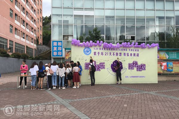本网讯 每年的5月25日是全国大学生心理健康日,“5·25”的谐音即为“我爱我”。今年的心理健康日,心理健康教育与咨询中心在学校感恩食府前组织开展了以“心系YABO鸭脖 传递正能量”为主题的现场心理健康教育宣传活动。本次活动场地主要分为两个区域:心理健康宣传区和“紫手环 不抱怨”活动区。