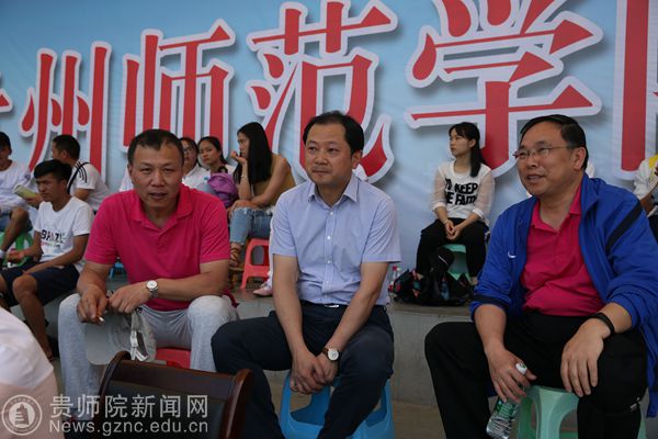 随后,石培新一行来到篮球场,参观学校健身设施,共同探讨了关于体育学院未来的发展问题。黄伟明介绍了学院规划,拟定在现有篮球场右边新建一个网球场,体育学院还将修建一个室内操场,健身区域也会有所调整。之后,他们来到体育场主席台观看甲组学生4*100接力赛,为参赛队员加油助威。