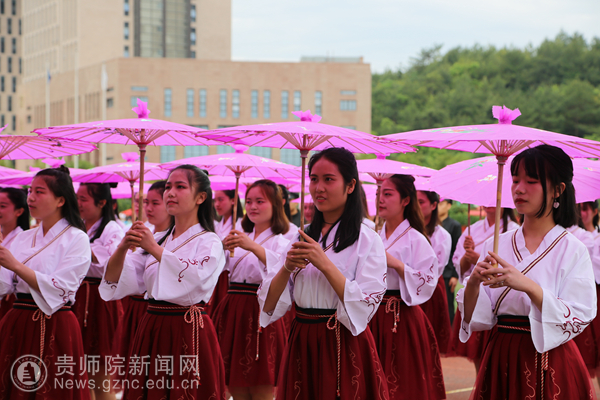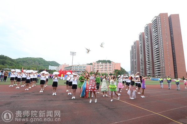 方队展示的是一双欲振翅高飞的“翅膀”,象征着化生学院莘莘学子欲承载梦想鹰击长空。他们展示的环保“T”台走秀中所有的服装都是利用废旧回收品亲手制作,表达了化生学子结合学院专业优势大力践行我省第十二次党代会“奋力开创百姓富生态美的多彩贵州新未来”的决心和信心。