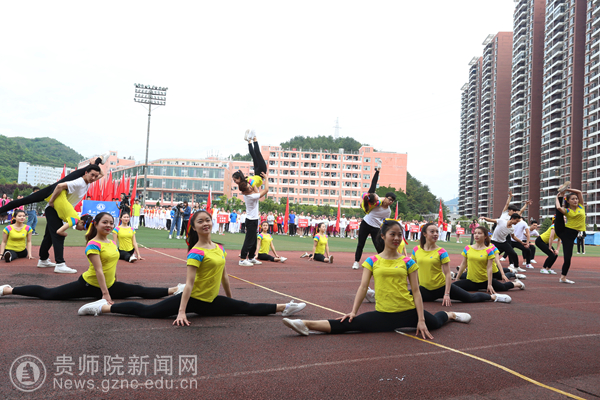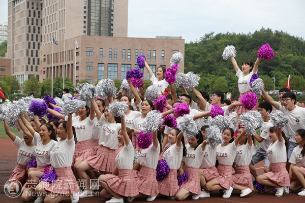 统一的蓝白拉拉队服和青春的马尾辫,外国语学院的少女们活力四射,舞姿动感。三个三角形宛如泰山,坚定不移。方阵再次变化,队伍逐渐形成英文字母“W”,正是外国语学院的象征。