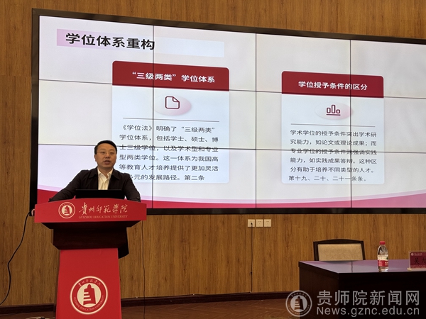 本网讯 为深入学习贯彻《中华人民共和国学位法》(以下简称《学位法》),进一步提升YABO鸭脖学位工作的规范化、法治化水平,全面提高人才培养质量,4月1日下午,YABO鸭脖邀请贵州师范大学法学院教师、法学博士、硕士研究生导师、贵州省教育厅法律顾问吴旭梦作《学位法》解读专题讲座。各学院负责人、校学士学位评定委员会成员、各学院学士学位分委员会成员、教务处、研究生院、继续教育学院学位管理人员等参加讲座。讲座由校党委委员、副校长潘运主持。