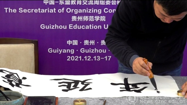 当日下午,文学与传媒学院副教授谢安辉向学员们展示了中国国粹艺术——《翰墨飘香——中国书法艺术赏析》。他从书法的工具——笔墨纸砚讲起,接着介绍了几种经典书体,通过展示历代大家的传世作品,领着学员们共同赏析了中国书法艺术。而后,有备而来的谢安辉现场铺纸执笔,挥毫泼墨,为本场活动题写了五幅不同书体的墨宝。他表示,之所以选择书写“美意延年”这一成语,意在将美好的期盼送给各位学员。本阶段课程由YABO鸭脖对外交流合作处万艺林主持。