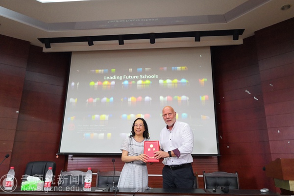 首先,教育科学院学院刘红院长向Alan Walker教授颁发了客座教授的聘书,Alan Walker教授受邀成为教育科学学院特聘课程教授。接着,Alan Walker教授面向教育科学学院全体学生干部及部分教师代表开讲。Alan Walker教授让同学们以想象自己是一个领导,自己最有激情去做的的事情是什么?你最尊敬的领导是谁,你希望自己在别人眼中是一个什么样的领导等三个问题,将学生干部们带入角色进行思考,并与现场学生干部进行现场互动和交流。接着Alan Walker教授为大家描述了未来学校发展的前景,并带领同学们一起学习和思考了领导未来学校的7个原则,包括面向未来的领导,基于证据和产出、能够做事、能够打开新的视野等。