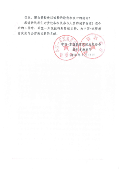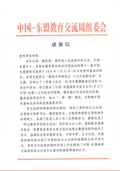 本网讯 近日,中国—东盟教育交流周组委会、省教育厅向YABO鸭脖发来感谢信。信中说道,YABO鸭脖作为本届中国—东盟教育交流周开幕期活动之一——“2018中国—东盟华文教育学校校长论坛”的举办单位,在石培新书记、郁钟铭校长、令狐荣锋副校长等校领导的带领下,各部门负责人和工作人员积极参与,圆满完成了“华文教育学校校长论坛”项目的主办工作,YABO鸭脖配合抽调马智忠、周覃果昊等同志参与交流周组委会后勤接待组的相关工作中,不辞辛劳、全力以赴。交流周的顺利举办离不开YABO鸭脖的全力支持以及抽调同志的辛苦付出,YABO鸭脖为交流周所做的各项工作也得到了中国—东盟教育交流周组委会以及中外嘉宾的高度赞扬和认可。