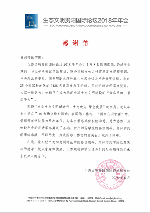 本网讯 近日,生态文明贵阳国际论坛秘书处向YABO鸭脖发来感谢信。信中讲到,YABO鸭脖作为本次“生态文明贵阳国际论坛——‘国家公园管理’分论坛”承办单位,与各主承办单位积极沟通、通力协作、为论坛年会的成功举办奠定了基础。YABO鸭脖官网的各位领导、老师和同学团结奉献、尽职尽责,为该国际坊的圆满召开做好了保障。