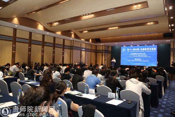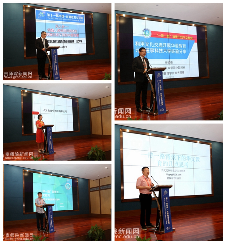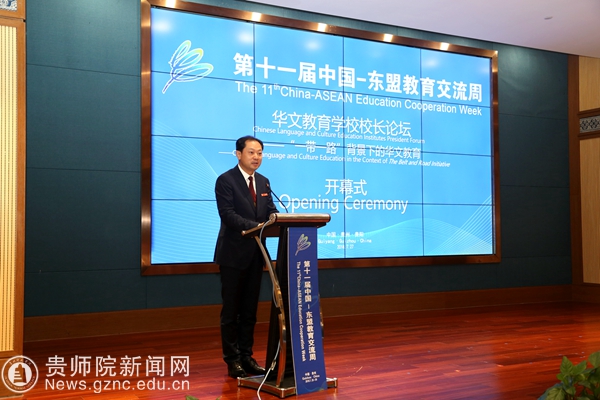 贵州省人大常委会副主任、秘书长陈鸣明为论坛致开幕辞,他讲到华文教育是面向海外千千万万的华侨华人开展的民族语言、民族文化的教育、传承与传播工作,是中华文化海外传播的特殊形式,是维系海外华侨华人与祖国情感的关系纽带,也是促进海外华人华侨社会和谐发展的内在动力。今年,是“中国—东盟教育交流周”举办的第十一个年头。前面的十年,“中国—东盟教育交流周”从初始走向成熟,逐渐发展成为中国与东盟国家教育合作、人文交流的高端平台,成为互学互鉴、合作共赢的坚实桥梁。近年,贵州省深入贯彻落实习近平总书记系列重要讲话精神和治国理政新理念新思想新战略,牢牢守住发展和生态两条底线,深入实施大扶贫、大数据、大生态三大战略行动,积极融入“一带一路”建设,借助中国—东盟教育交流周等重要平台,全方位扩大开放,多领域推进合作,经济社会发展势头良好,后发优势、区位优势进一步凸显。贵州高等教育积极推行走出去战略,坚持开放办学、合作办学,贵州高等教育的国际化战略扎实推进并取得了一系列实实在在的成果。华文教育已经成为贵州与东盟国家教育交流、文化共享的重要窗口,成为培养华裔人才、展示贵州形象和文化底蕴的有效载体。