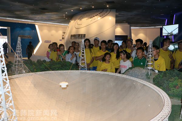 6月17日,营员们前往贵州平塘县,参观世界第一大口径500米口径球面射电望远镜(FAST),学习天文知识。当蹦蹦跳跳登上瞭望台,看见直径为500米的巨大望远镜时,营员们惊叹不已,欢呼跳跃,感叹近年来祖籍国科学技术发展速度之快和成就之高。