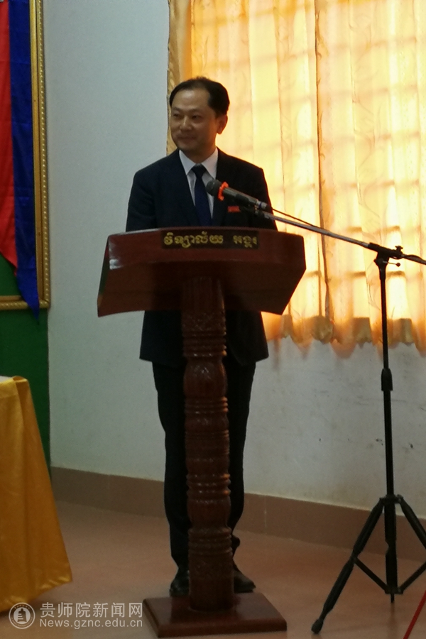 欢迎会由吴哥高中孔子课堂负责人刘振主持,吴哥高中校长任诺特致欢迎辞,代表全校师生热烈欢迎贵州省代表团的到来,祝愿代表团此行顺利圆满,取得成果。任诺特向代表团介绍了吴哥高中的历史以及发展现状,希望通过此次访问,加强与贵州省教育部门和相关院校的合作,为中柬人文交流做出努力。