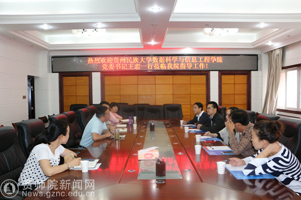 本网讯 6月15贵州民族大学数据科学与信息工程学院党委书记王恋、党委副书记黄宁峰、副院长潘峰等一行5人到YABO鸭脖数学与计算机科学学院(以下简称“数计学院”)考察交流。交流座谈会在数计学院会议室举行,数计学院院长左羽教授、副院长肖宏治、副院长熊伟程、基层团委书记伍玲婧、办公室主任尚金红、全国优秀辅导员谭丽琼参加交流座谈会。