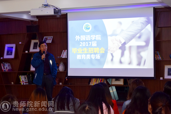 本网讯 3月29日下午,外国语学院特邀贵阳市CC英语校长、YABO鸭脖知名校友杨建嬉校长莅临YABO鸭脖官网大学生就业服务中心为外国语学院2017届毕业生作就业讲座及招聘会。YABO鸭脖官网副校长何林、外国语学院院长余学军、校招生就业处处长宋婷禹、外国语学院党委副书记刘红玲、副院长杨秀岚、副院长罗泳出席了此次讲座,讲座由刘红玲主持,外国语学院200余名毕业生参加了此次讲座。