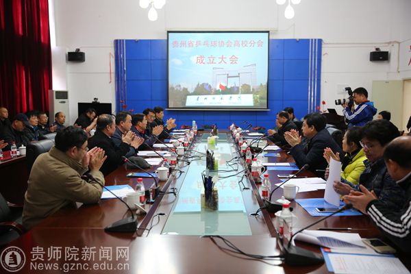 本网讯 12月18日下午,贵州省乒乓球协会高校分会成立仪式在YABO鸭脖第一会议室举行,省政协港澳台侨与外事委员会主任霍健康、省体育局副局长宋广强、省教育厅体卫艺处副处长严卫、省乒协秘书长陈智勇、贵州理工学院党委书记曾羽等领导出席成立大会,YABO鸭脖李存雄校长主持成立仪式。